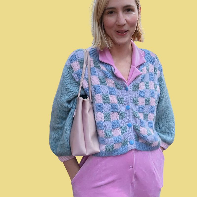 Die Elmer-Strickjacke ist eine große, farbenfrohe und strukturierte Strickjacke. Die Struktur entsteht durch abwechselnde Quadrate in Links- und Rechtsstrick. Ihr mehrfarbiges, kariertes Muster erinnert an Elmer, den Elefanten aus Kinderreimen.