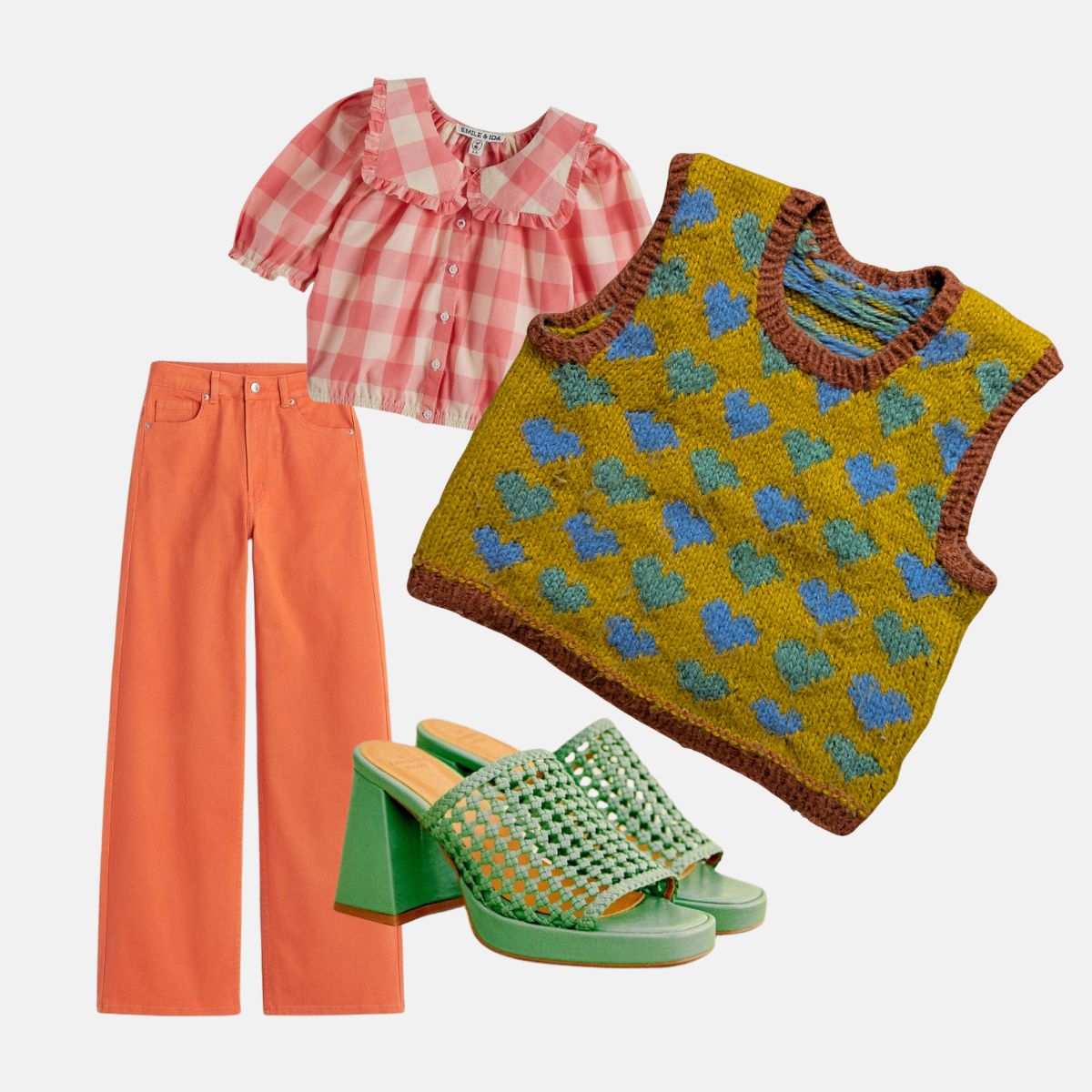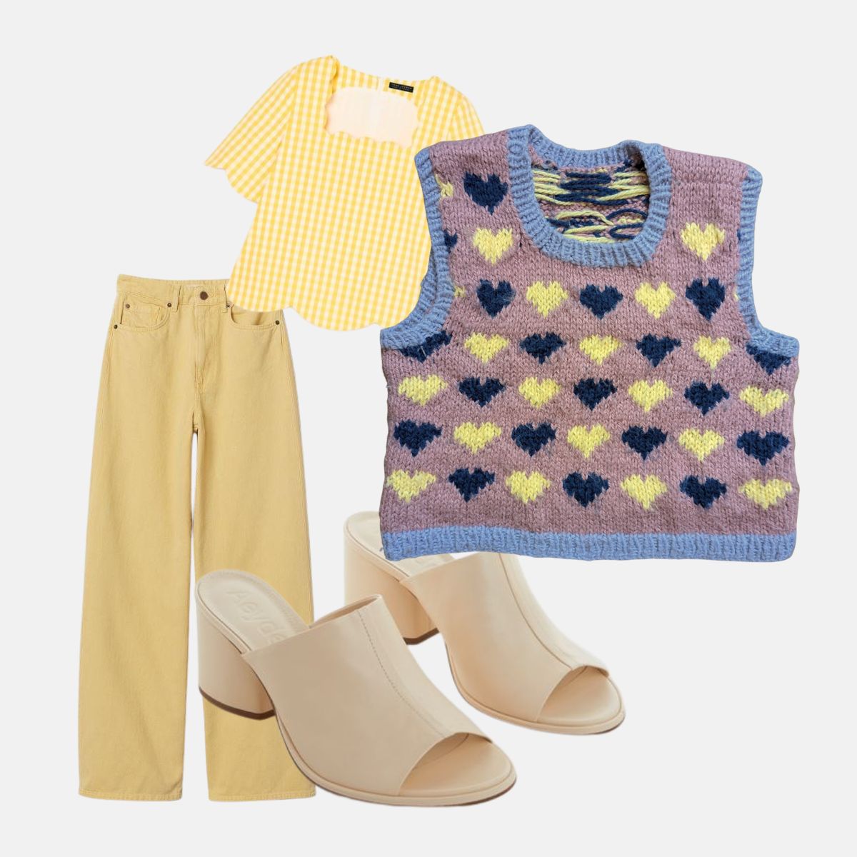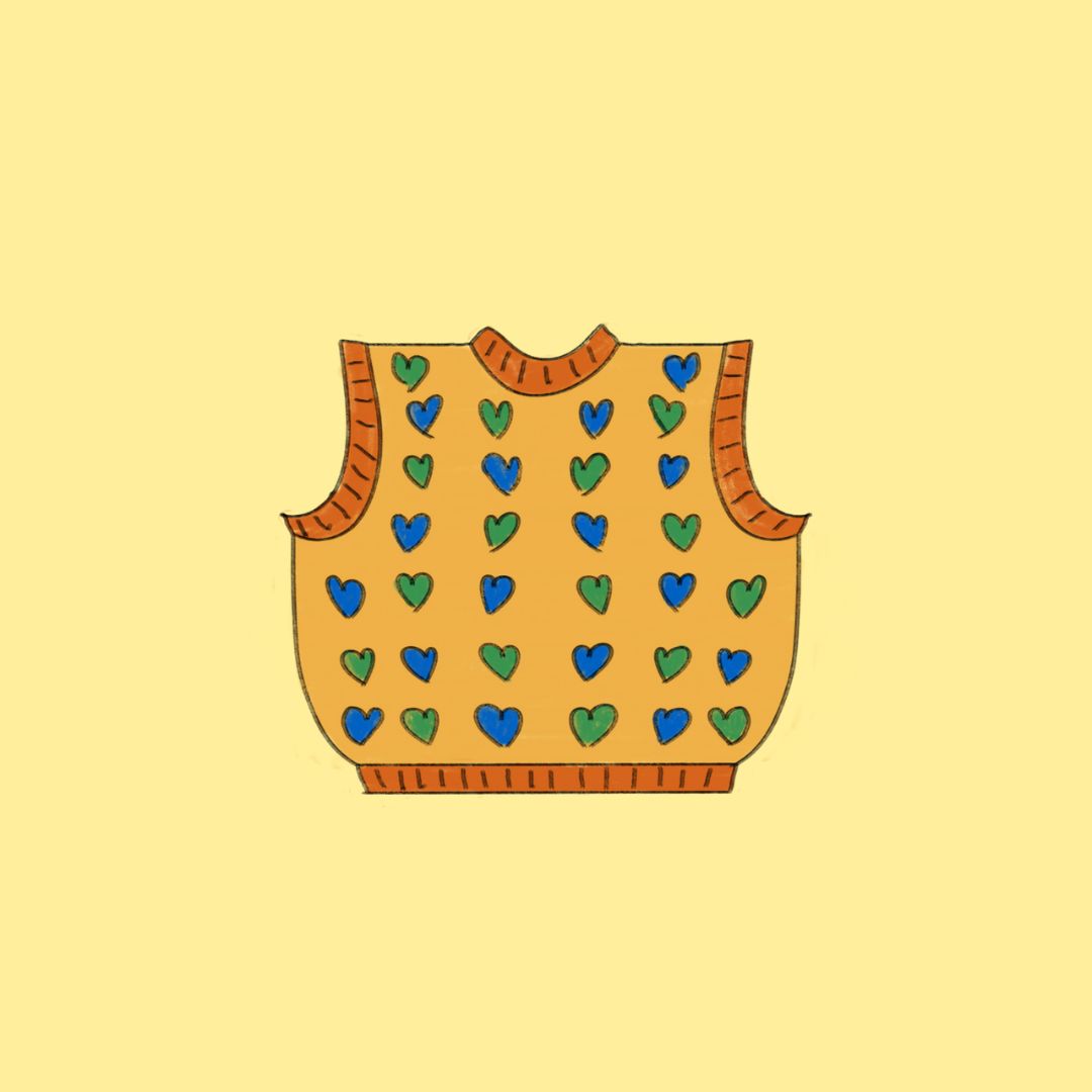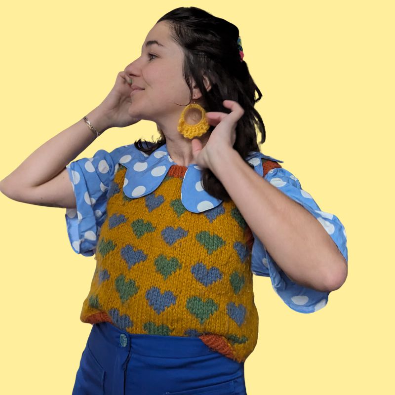 Mon Amour vest is a colorful, heart patterned sleeveless sweater. It's a positive ease shape with a large rond neckline.